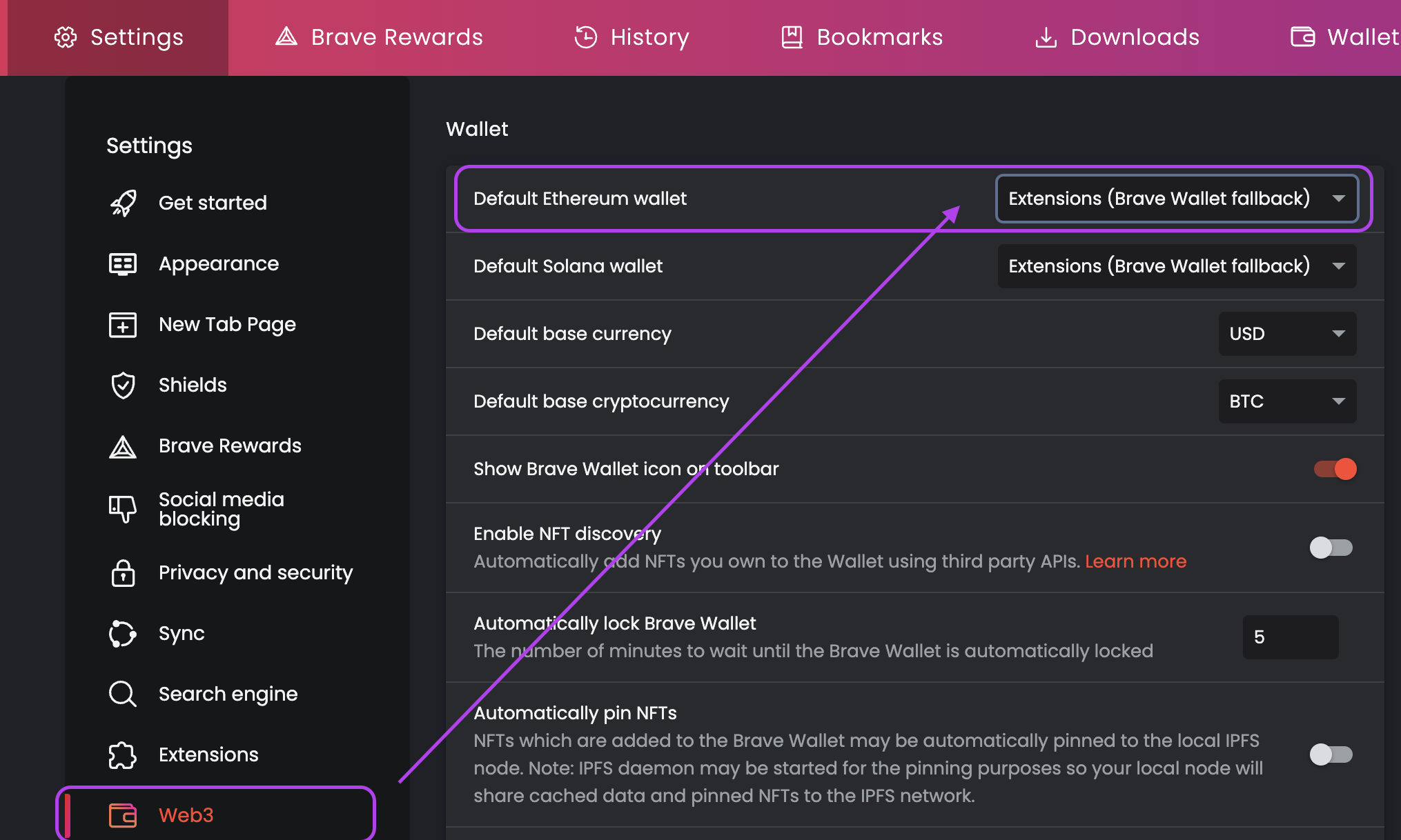 - Select Extensions (Brave Wallet Fallback) for Default Ethereum Wallet