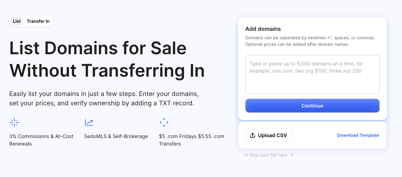 To start, head to the List Domains for Sale Without Transferring In landing page here.