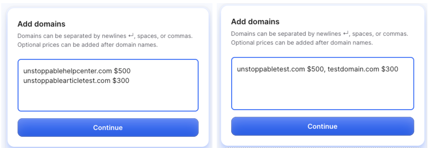You can enter up to 5,000 domains at a time. They can be on a new line for each or separated by commas. You can optionally include a price after each domain name.