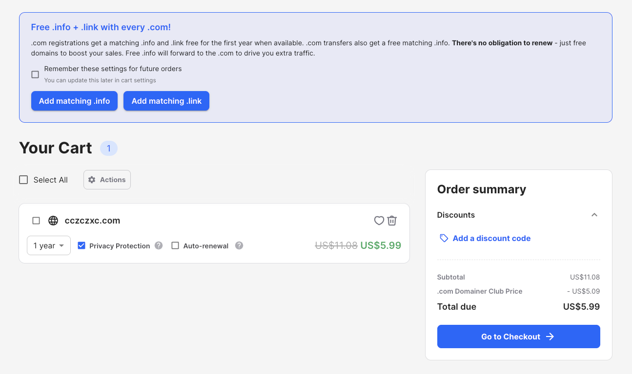 When you first add .com's to your cart, you will be prompted to click buttons to add the free .info and .link at the top. You can also save those settings for future orders.