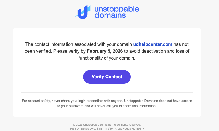 If the email you entered when you setup the contact has never been verified before for Whois with Unstoppable Domains, you will receive an email from no-reply@unstoppabledomains.com to verify it.